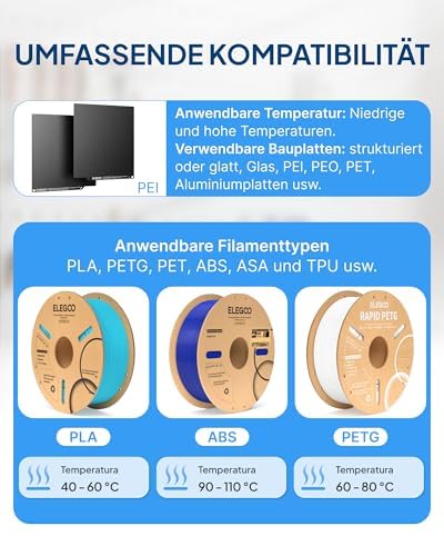 Der ELEGOO 3D-Druckerkleber zeichnet sich durch seine universelle Anwendbarkeit aus. Er funktioniert nicht nur hervorragend mit gängigen Filamenten wie ABS, PLA, PETG und TPU, sondern ist auch mit einer Vielzahl von Bauoberflächen kompatibel. Ob glatte oder strukturierte PEI-, Hartglas-, PEO-, PET- oder Aluminium-Hotbeds – dieser Kleber verhindert zuverlässig Verformungen und sorgt für eine stabile Druckbasis.