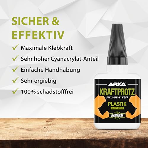 Die spezielle Variante ARKA Kraftprotz Plastic ist besonders für Kunststoffe geeignet und bietet Ihnen die Möglichkeit, transparente und dezente Klebestellen zu kreieren. Dies macht ihn zum perfekten Partner für Anwendungen, bei denen ästhetische Ansprüche an die Klebestelle hohe Priorität haben.