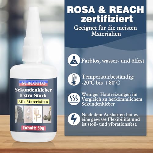 Unser Surcotto Sekundenkleber ist ROHS & REACH zertifiziert und wurde gründlich getestet, um sicherzustellen, dass er keine schädlichen Substanzen enthält. Dies ist nicht nur gut für die Umwelt, sondern schont auch die menschliche Gesundheit. Im Vergleich zu herkömmlichen Sekundenklebern verursacht er weniger Hautreizungen und ist somit eine sichere Wahl für fast jeden Anwendungsbereich.