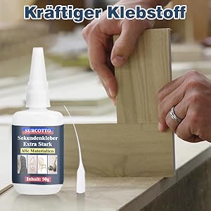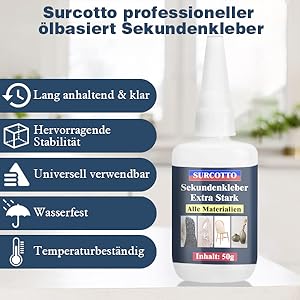 Der Surcotto Extra Stark Sekundenkleber bietet Ihnen eine unvergleichliche Kombination aus Geschwindigkeit, Vielseitigkeit und Sicherheit. Ideal für alle Klebeeinsätze, bei denen es auf Schnelligkeit und Festigkeit ankommt. Vertrauen Sie auf einen Kleber, der auch unter herausfordernden Bedingungen sein volles Potenzial entfaltet und Ihre Projekte zum Erfolg führt.