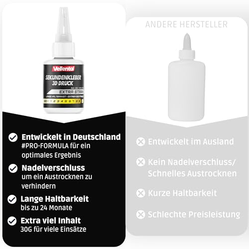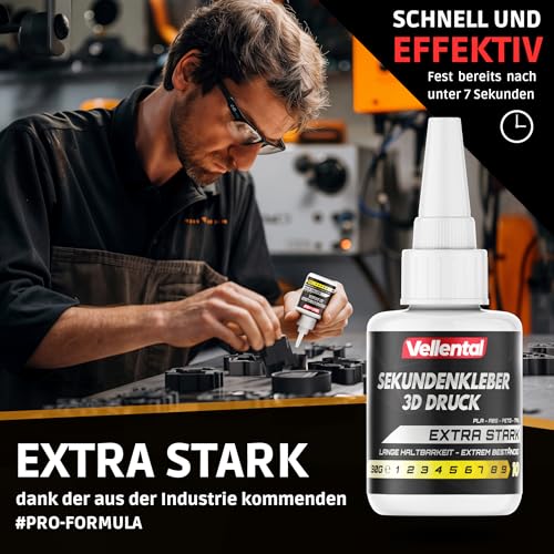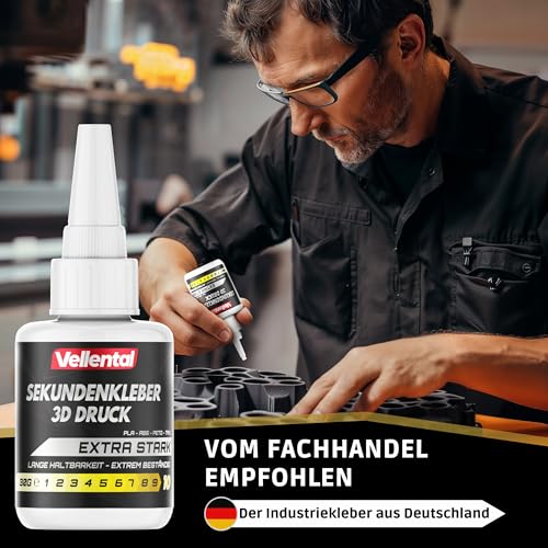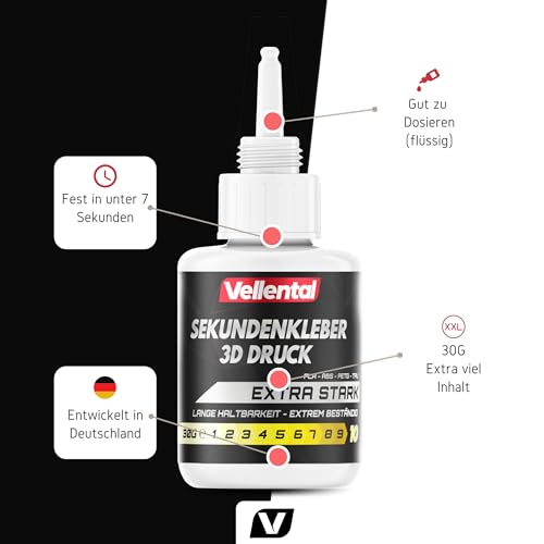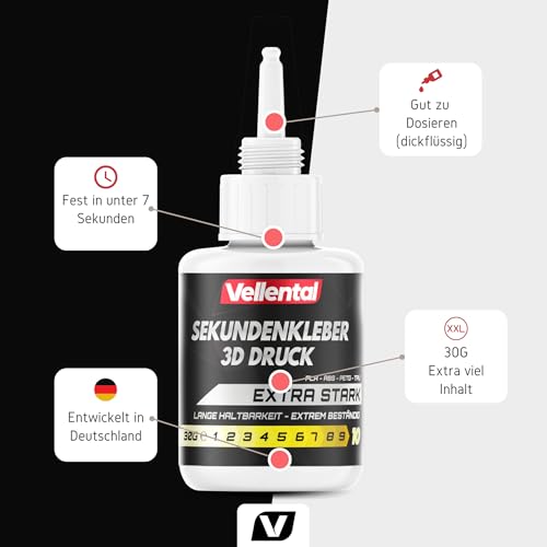 Unser Sekundenkleber wurde speziell für die Verklebung von 3D Druck Filamenten wie PLA, ABS, PETG und TPU entwickelt. Mit seiner deutschen Industriequalität garantiert er blitzschnelle und ultrastarke Verbindungen, die auch unter hoher Belastung zuverlässige Ergebnisse liefern. Egal, ob Sie komplexe Modelle oder einfache Teile zusammenfügen möchten – dieser Kleber bietet Ihnen die dauerhafte und hoch belastbare Verklebung, die Sie benötigen.