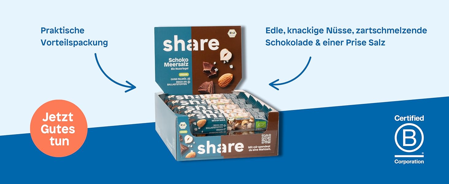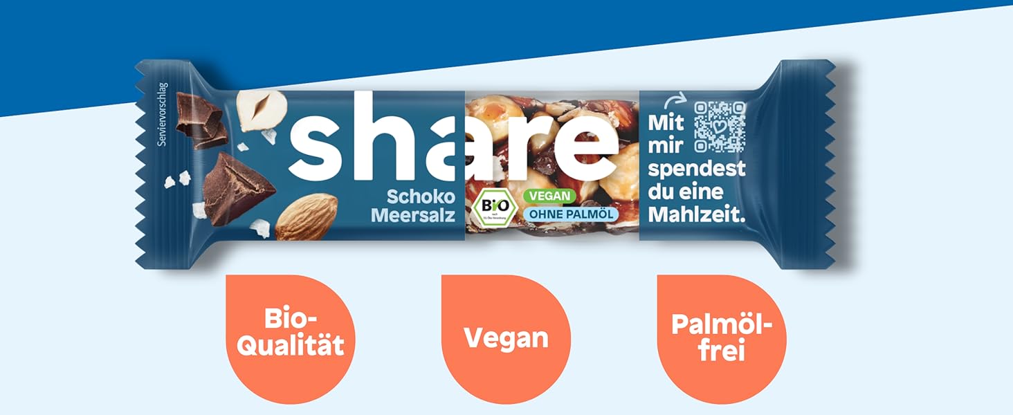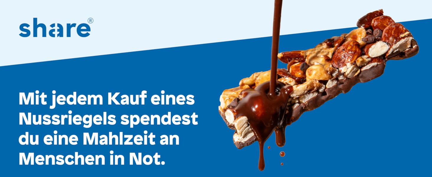 Wir glauben an die Kraft des Gebens. Mit jedem Kauf eines share Bio Nussriegels leisten Sie einen Beitrag zu einer besseren Welt. Ihr Snack unterstützt nicht nur Ihr Wohlbefinden, sondern hilft auch, eine Mahlzeit an einen Menschen in Not zu spenden. Genießen Sie nicht nur geschmackvollen Genuss, sondern auch das gute Gefühl, etwas zu bewirken.
